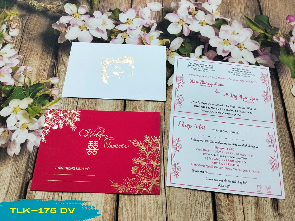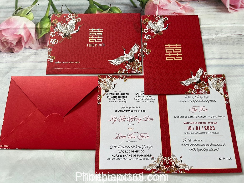 Mẫu thiệp đỏ được in offset sắc nắt kết hợp ép kim cùng họa tiết truyền thống mang lại vẻ đẹp hài hòa đẹp, hiện đại và giá rẻ