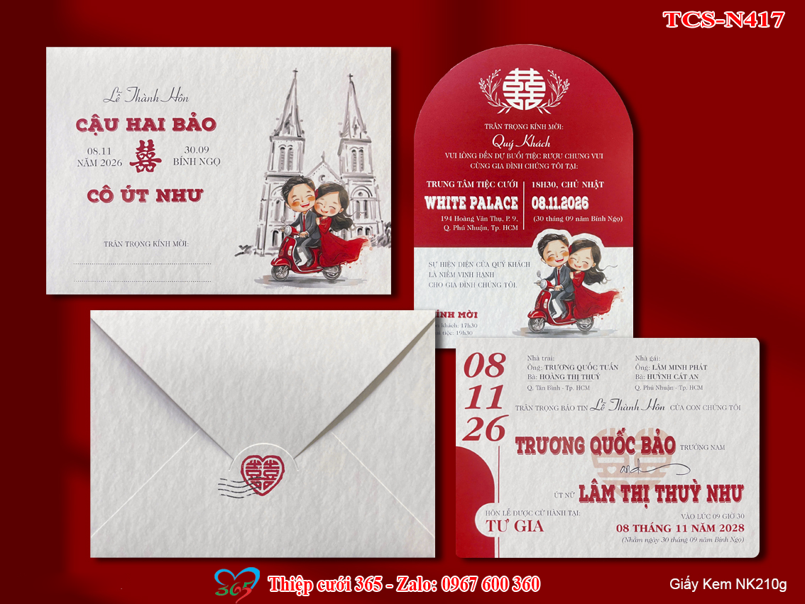 Mẫu thiệp cưới kiểu đứng lớn in laser sắc nét màu xám nhẹ, họa tiết chibi xe vespa mã TCS-D417